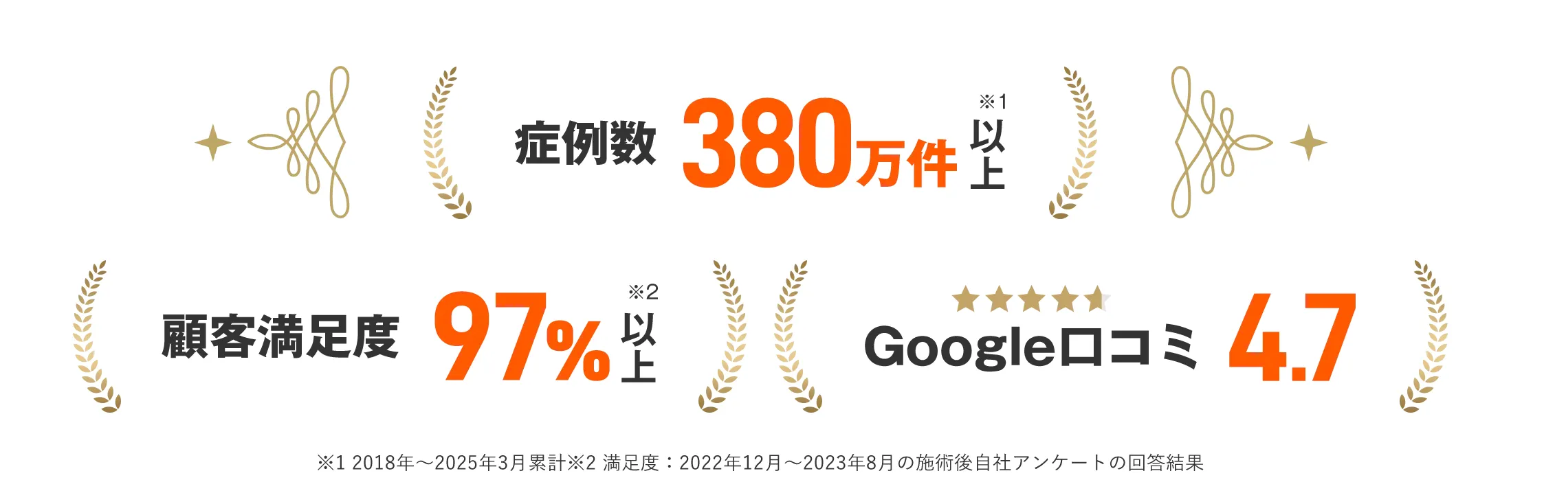 - 経験者の満足度97%!Google評価★4.7◎ 症例数380万件を突破する実績あり!
