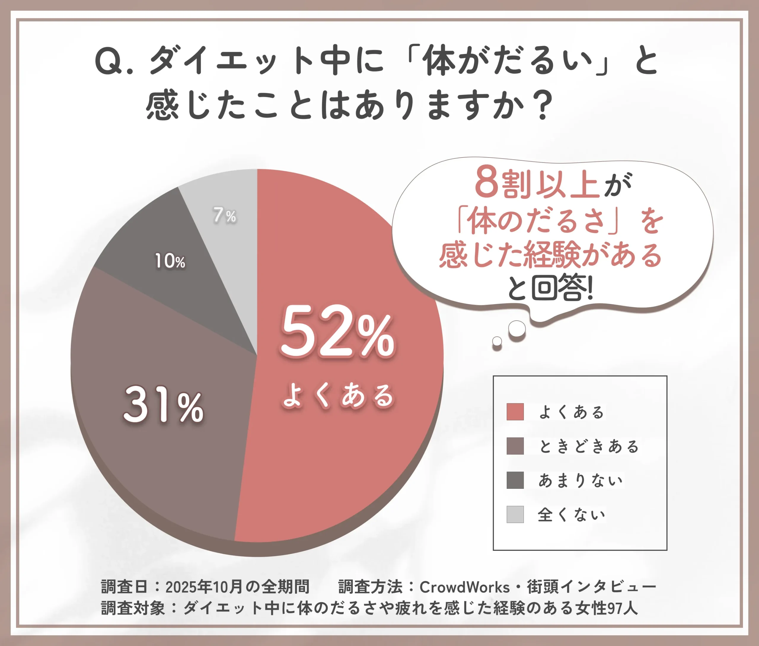 - 調査対象:ダイエット中に体のだるさや疲れを感じた経験のある女性97人