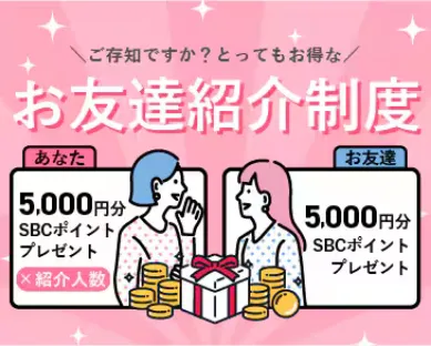 | 割引・キャンペーン | モニター価格あり ポイント会員制度:ご利用金額の1%~6%ポイント還元 お友達紹介制度:紹介者とお友達に5,000円分SBCポイントプレゼント SBC公式アプリでメールアドレス登録とLINE連携で2,000円OFFチケットプレゼント |