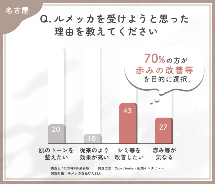アンケートの結果、70%の方が「色ムラや赤みの改善」を目的にルメッカを受けていることが分かりました。