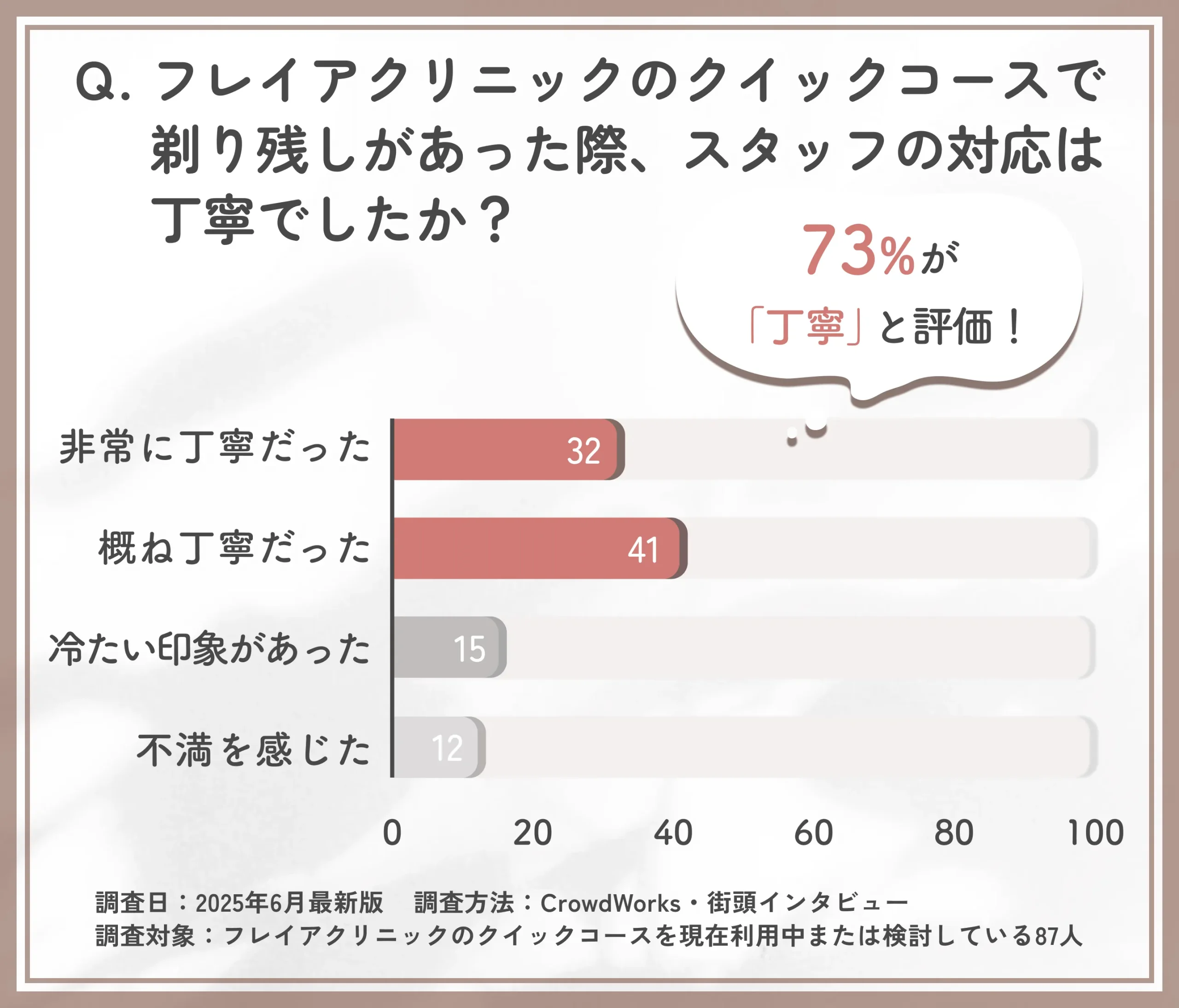 編集部施術に対する満足度はもちろん、カウンセリングからアフターフォローまで総合的に満足度が高いと、安心して施術を受けられますね。