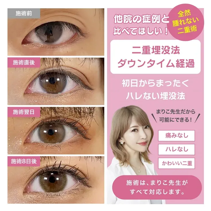 先日埋没とクマ取りを施術しました。 院内とても綺麗でカウンセリングは必要な施術しか勧められないし、しっかり話を聞いて下さります。静脈麻酔使用を決意したのが直前だったのにしっかり対応して下さりとても親身になって不安要素を取り除いてくださったので有難かったです。 すごく悩んで決断した施術でしたが完成がとても綺麗で施術して良かったです!