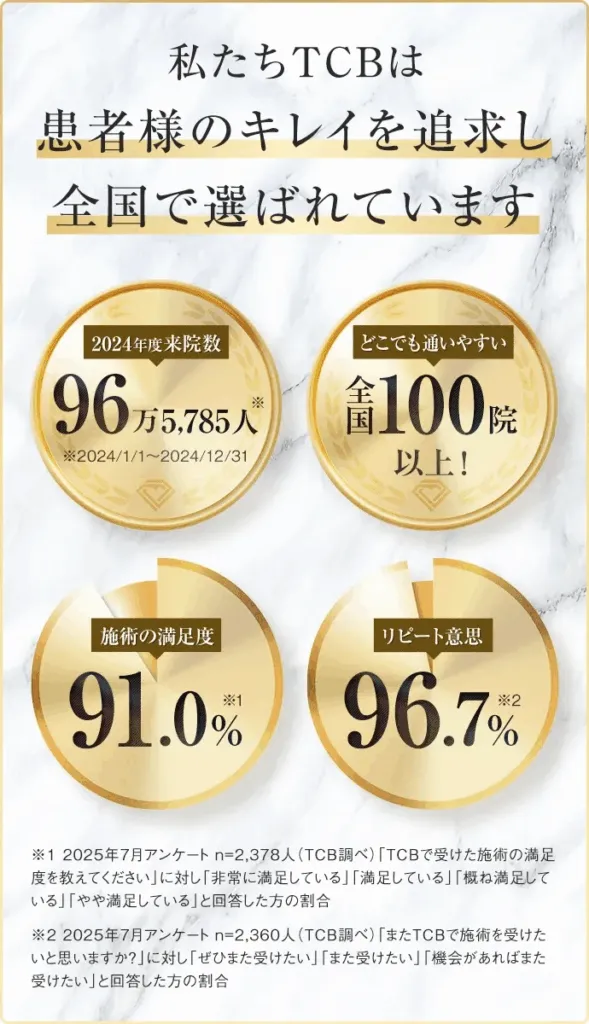 TCB東京中央美容外科 は、利用経験者の満足度が91%と、高い評判を集めている大手美容クリニックです。