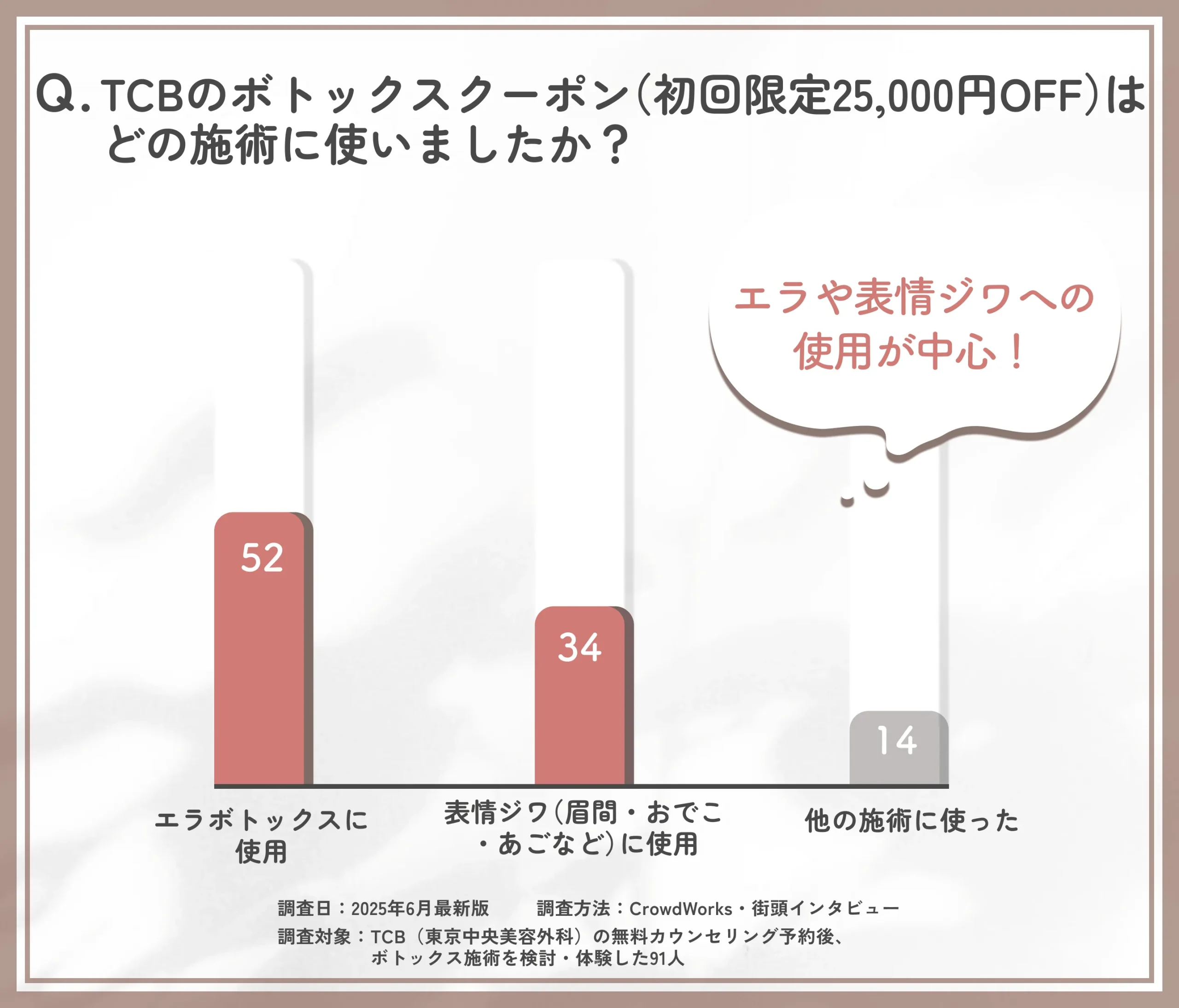 調査の結果、TCBのボトックス無料クーポンは、エラや表情ジワへの使用が中心であることが分かりました。